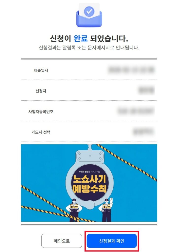 [선택한 카드사를 한번 더 확인 한후 아래쪽의 신청자 정보를 확인해보세요. ‘제출완료’ 버튼을 클릭합니다.